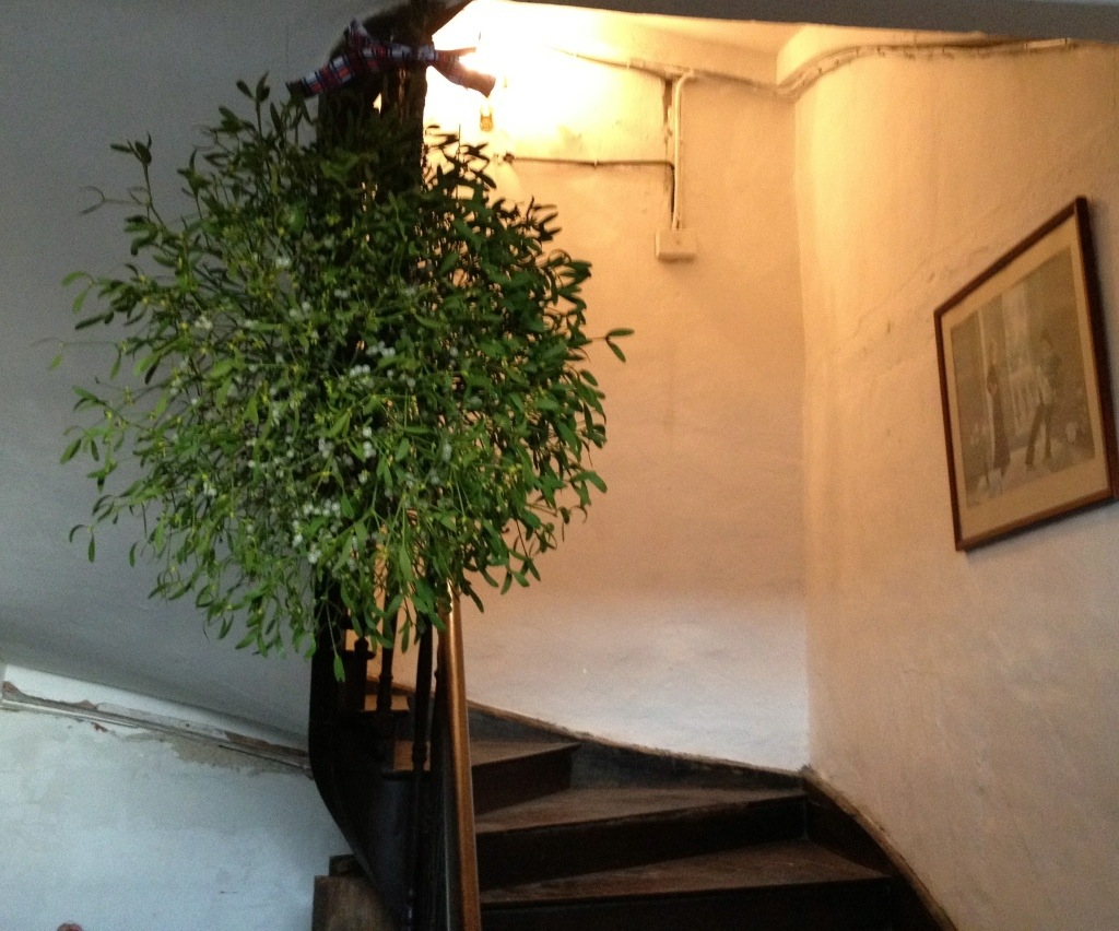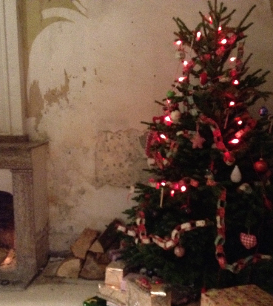 Peter and the boys bought a huge tree that filled one ‘kings speech’ style corner of our salon. And because we now had a concrete floor in the salon, we moved all Christmas operations into it. The table we normally use in the garden with a white linen tablecloth to disguise the fact it’s an outdoor table. And mistletoe found in abundance in our woods.