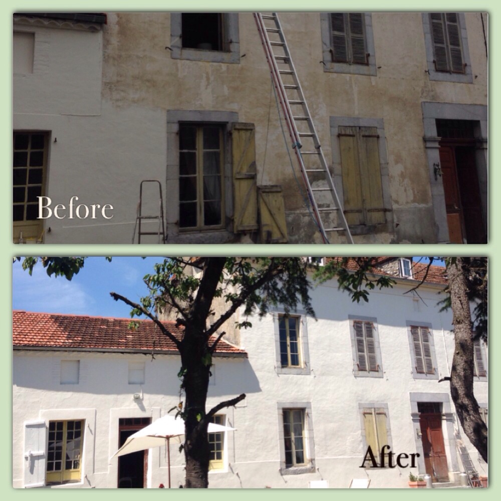 And so my colour plans began. I decided to keep it simple with beigey, cream walls and white shutters. This would keep costs down (white eggshell cheaper than coloured and easier to repaint) but it would also keep the house relatively true to its history. After a thorough search and tester potstravaganza of fifty shades of cream I settled on one called doves bum or some such and took it to Homebase. “Oh no love – we don’t do colour match masonry paint,” said a helpful man. “But look, this premixed one is virtually the same – Cornish Cream” he added. And so I bought 80 litres of it. And we drove the 80 litres to France. And Peter could hardly wait to get started so on the first day of our Hols he painted a side wall – just to check I still liked it….