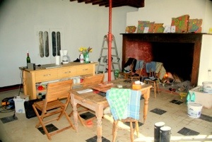 As everything in the house needed total renovation, it was hard to know where to start. But as the kitchen had our only source of heat – an enormous fireplace complete with iron chain to hang cauldron. Plus it needed little structural work – except for a large Acroprop needed to keep the ceiling in place and the floor above. AND as my parents had promised an imminent visit and would for sure want cups of tea, maybe even somewhere to sit, this was the place to start.